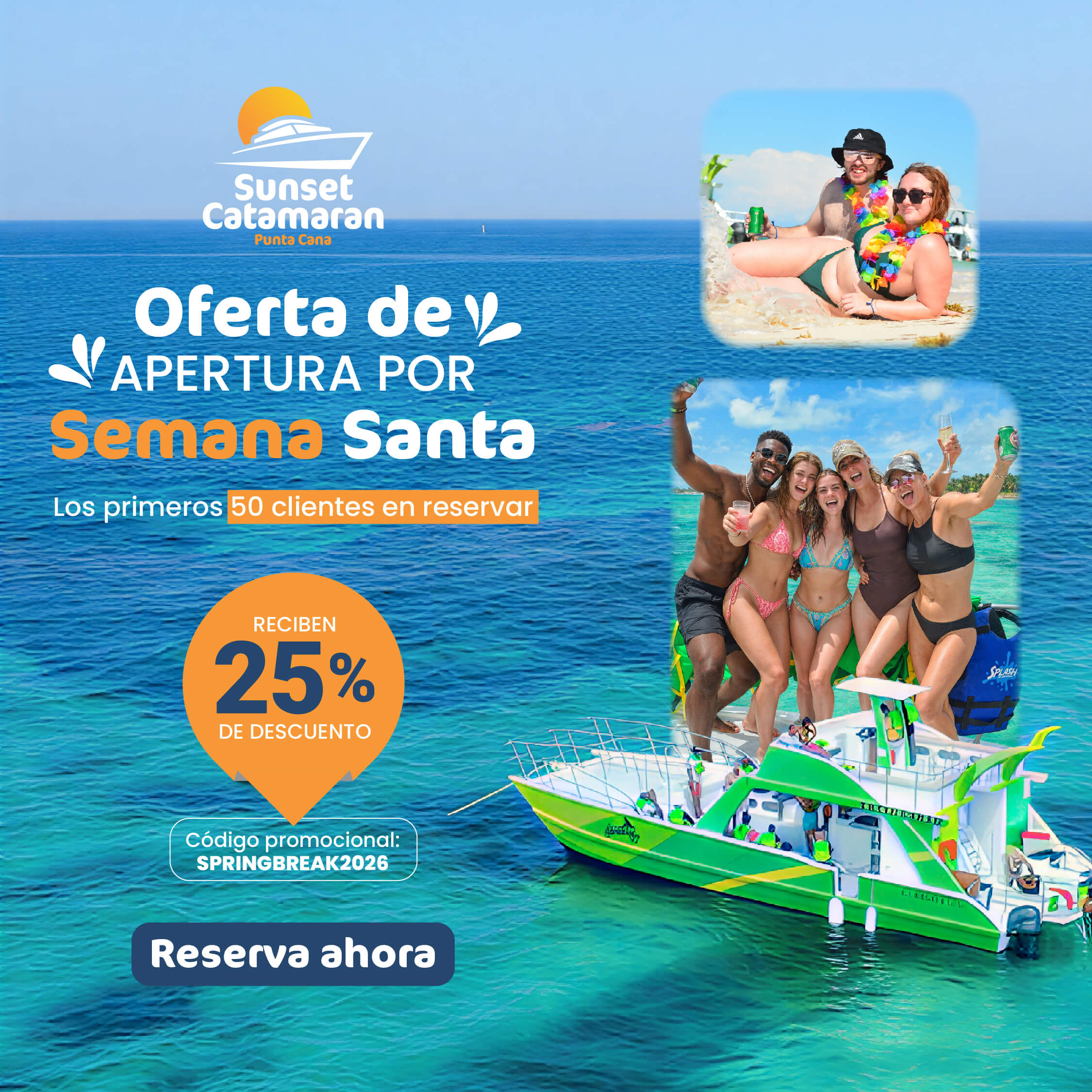 Navega por aguas cristalinas, disfruta de snorkel, open bar y música, y vive uno de los atardeceres más icónicos de Punta Cana a bordo de nuestros catamaranes.